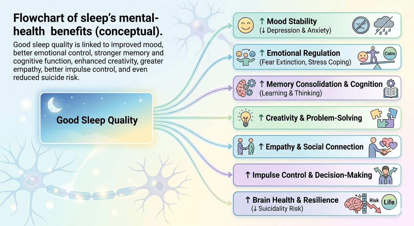 This is perhaps the most important benefit of all. Research shows that people with chronic insomnia or poor sleep have more than double the risk of suicidal thoughts and attempts compared to those who sleep well. Sleep disturbance is considered an independent risk factor for self-harm, separate from depression or other diagnoses.